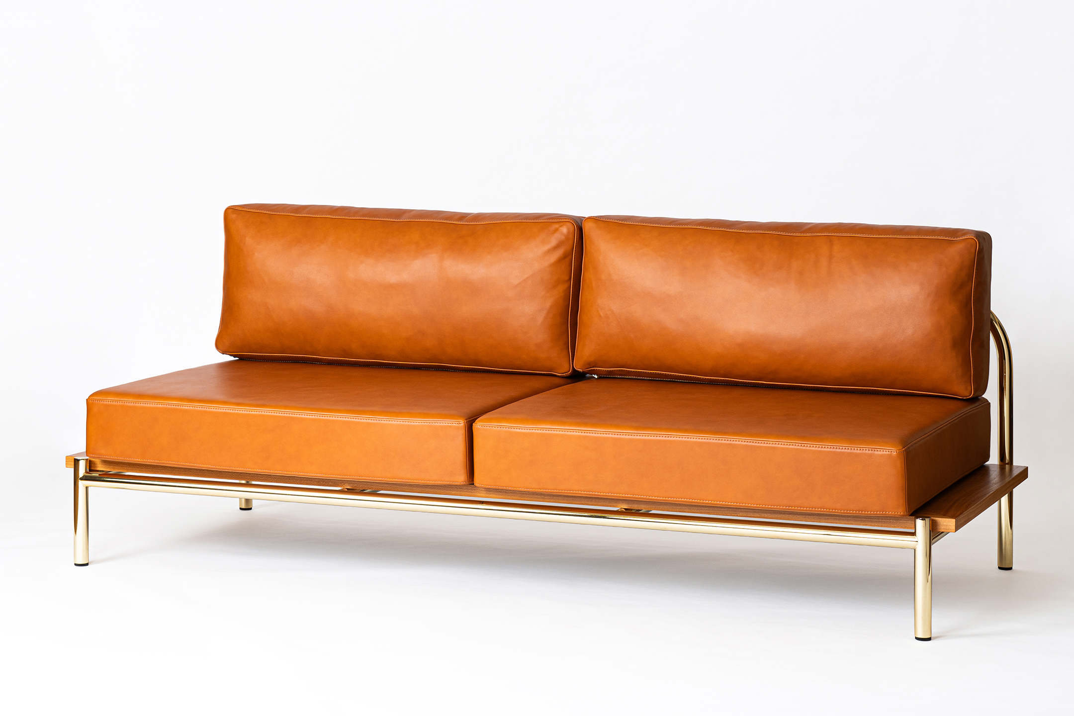 A sofa that combines keyaki wood and brass-plated accents with brown cowhide leather. The keyaki wood extends slightly beyond the brass-plated 31.8φ frame, creating a distinct presence and refined structural balance.