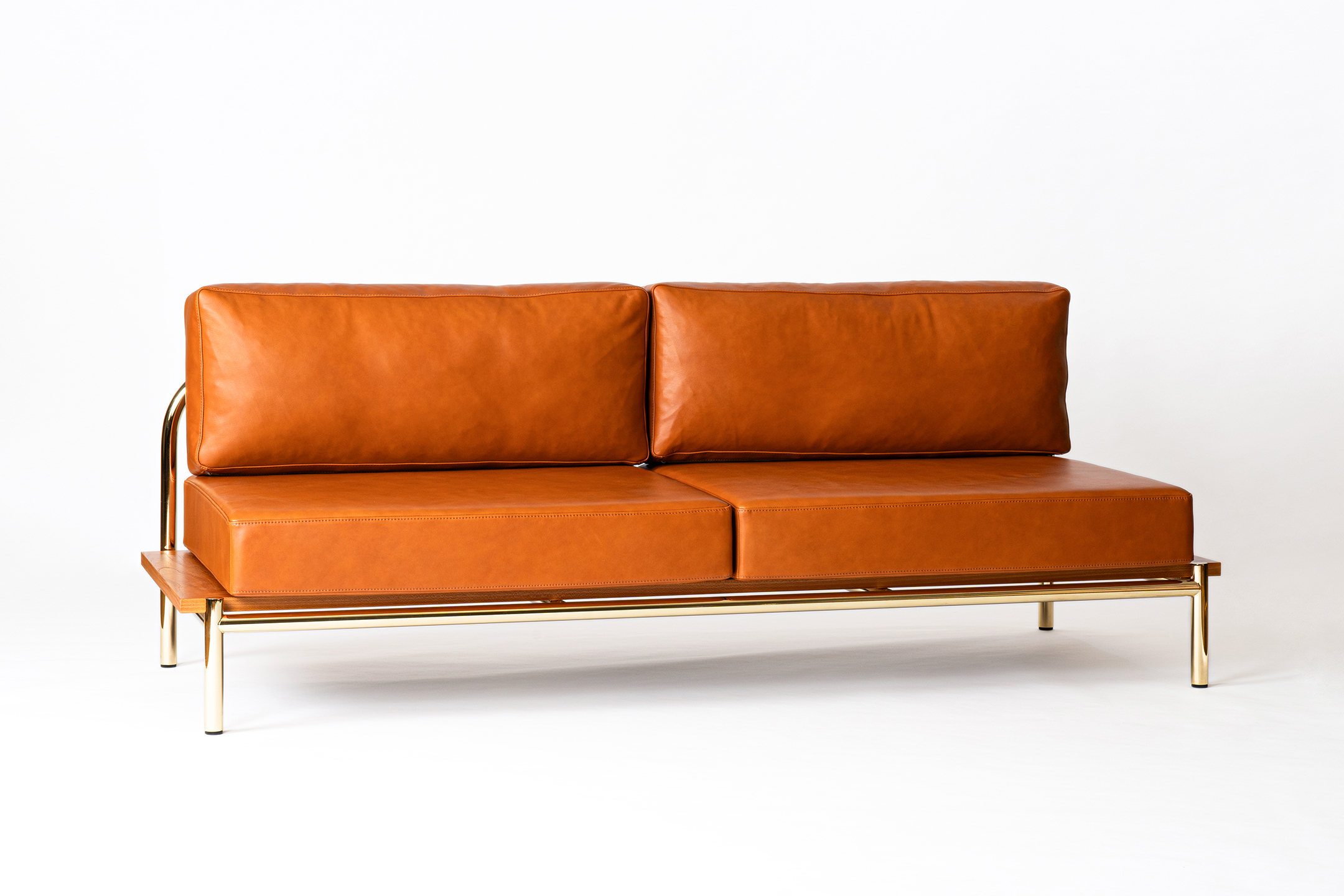 欅と真鍮メッキにブラウンのカウレザーを組み合わせたソファ。31.8φの真鍮メッキを施したフレームから欅材をはみ出させることで存在感を生み出します。